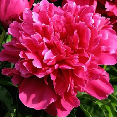 Особое внимание следует уделить цветкам этого сорта. Виктуар де ла Марн имеет полумахровое строение цветка среднего размера, достигающее в диаметре 18 см. Розово-красный цвет лепестков с легким сиреневым оттенком создает эффект нежности и элегантности. Края лепестков более светлые, что добавляет цветку глубины и объема. Слабый аромат не отвлекает от основной задачи — наслаждения эстетикой. Рассечение на кончиках лепестков создаёт легкость и пышность, что особенно подчеркивает изящество пионов. В срезке эти цветы долго остаются свежими, делая их идеальными для букетов.