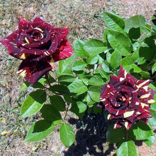Абракадабра привлекает внимание своей уникальной окраской. Бутон имеет темно-бордовый цвет с лимонно-желтыми мазками и полосами, которые при раскрытии превращаются в темно-красно-коричневые цветы с такими же яркими лимонными акцентами. Основная окраска цветка – красная, что создает контраст и делает его выделяющимся среди других роз. Цветы отличаются бокаловидной формой и имеют высокий центр с заостренными лепестками, придавая им элегантный вид.